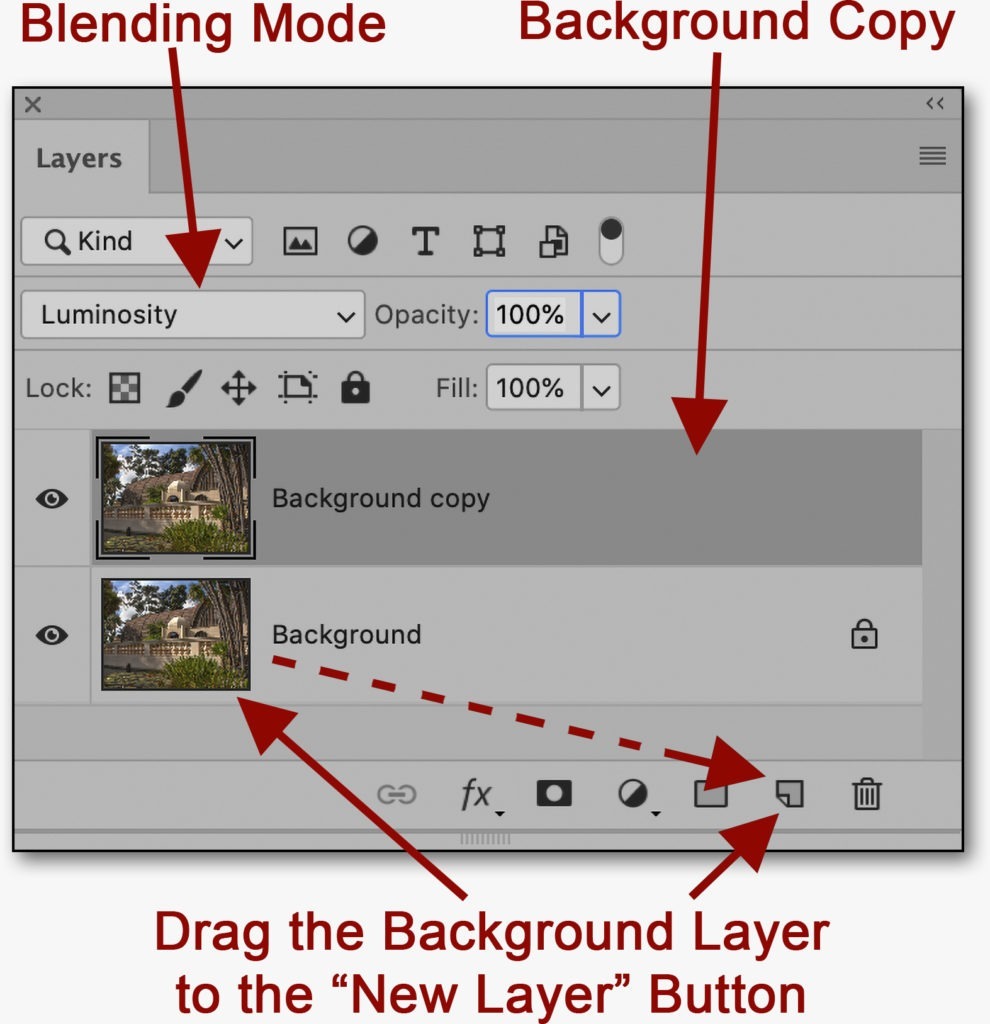 • Step 1 – Create a New Background Layer Copy: To create a Background Copy, simply drag the original Background Layer to the “New Layer” button.