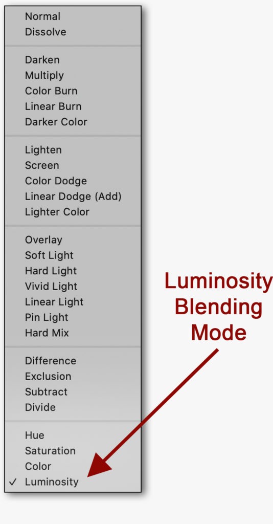 • Step 2 – Change the Blend Mode: Make sure that your Background Copy is highlighted (as shown), then change the Blending Mode to “Luminosity” from the drop-down menu.