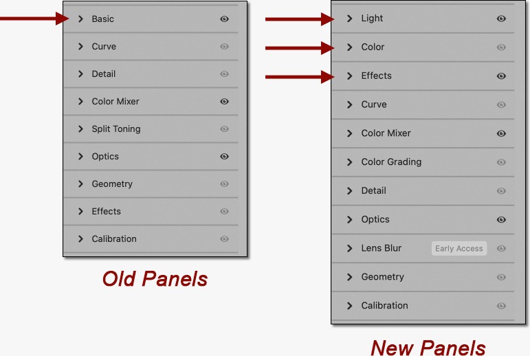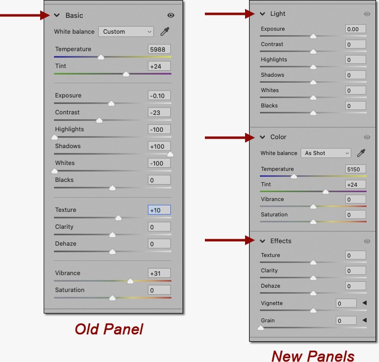 Here’s the biggest change – the “Basic” Panel (in the Old Panel configuration) has been split into 3 separate Panels (in the New  Panel configuration):  “Light”, “Color” & “Effects”.