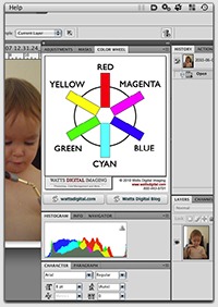 If you have Photoshop CS4 or CS5, you have the ability to use Custom Panels built using specialized Adobe software. Here’s one with the Color Wheel on it – You’ll also find handy links to both my website and my blog…