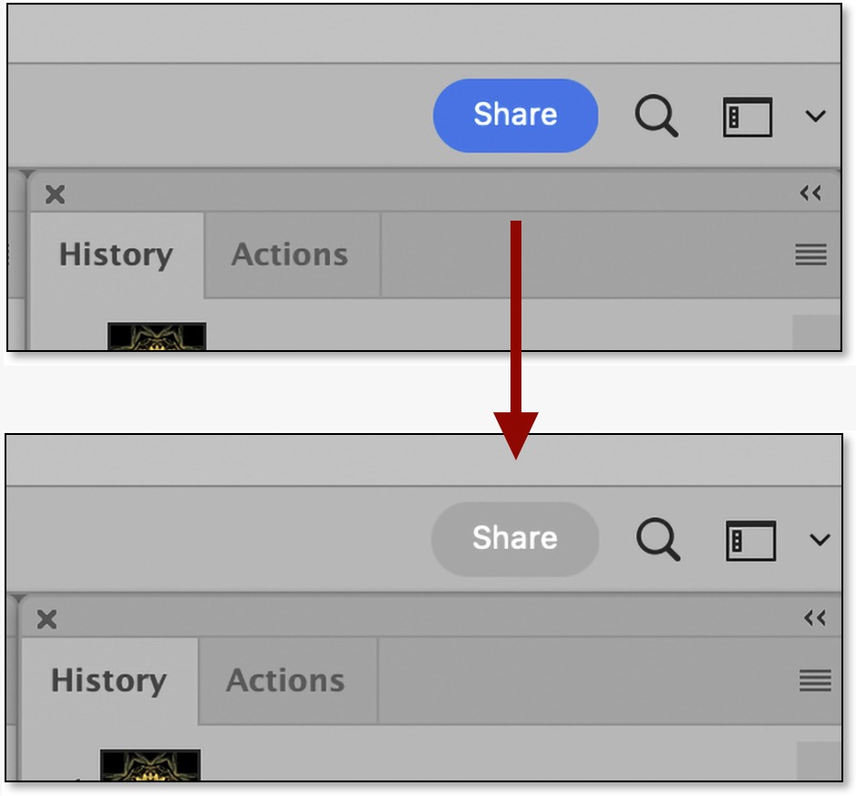 7) Open Photoshop – with an image open, the “Share” button will now be gray – – NOT a distracting & ugly blue – mission accomplished!