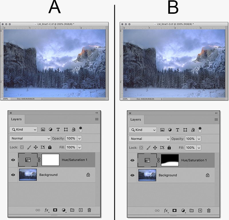 • The snowy foreground & trees in Image “A” are too blue, while the rest of the image’s color hue looks fine. Using Strategy #1, a Hue/Saturation Adjustment Layer is created to de-saturate the blue hue (we discussed Adjustment Layers extensively in Part 1).