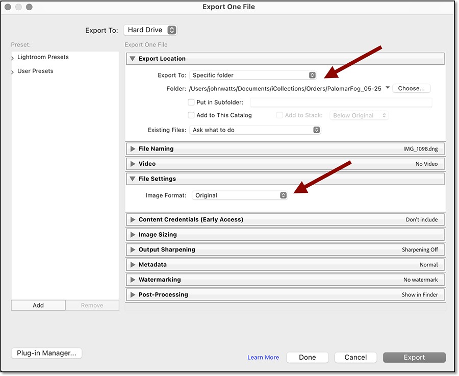 A) Under “Export Location”: export the RAW file with a unique name to a new unique folder or subfolder (See chapter 11 in my book for suggested File Naming Conventions).
