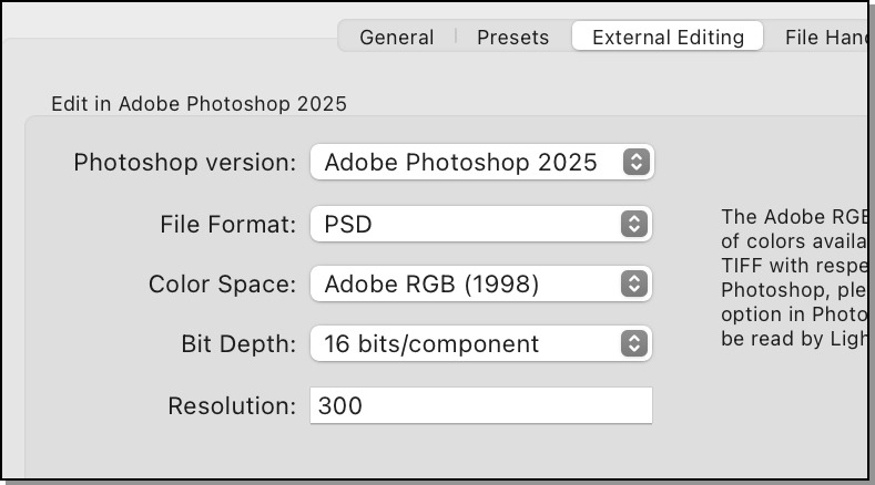 First, some quick (but necessary) housekeeping: In Lightroom, go to “Preferences” -> “External Editing”, and use the suggested settings shown below, regardless of what it says in the description to the right – you only have to do this once …
