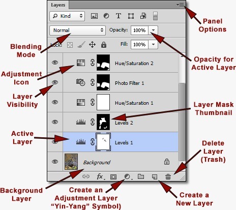 The Layers Panel is where you’ll manage all of your Layers, including Adjustment Layers. As mentioned previously, think of this as a 2-dimensional “side-view” of your original image (the “Background Layer”), with your Layers (“clear plastic overlays”) stacked on top of it.