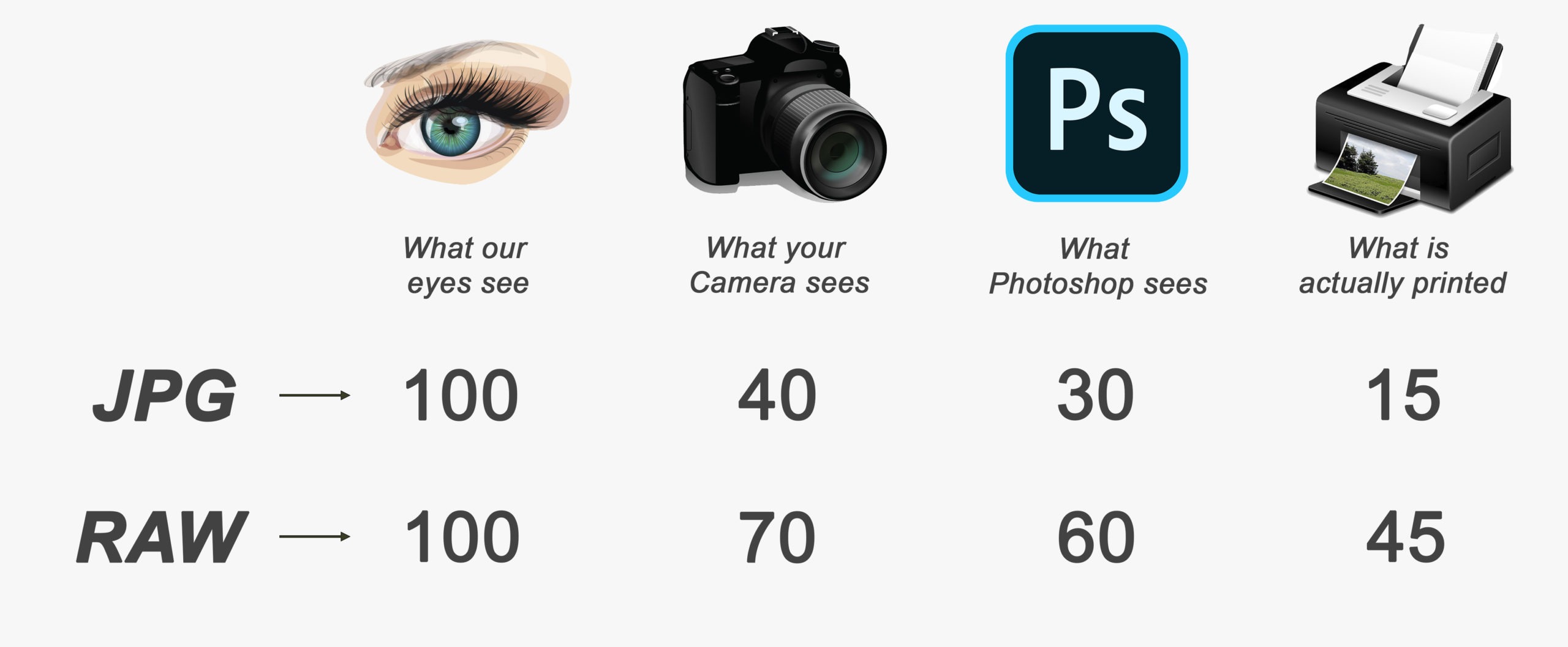 • Let’s say, for example, that our eyes see 100 shades of red. The camera, shot in RAW (16 bit), may see only 70 shades. Then Photoshop may only see 60 shades of red, and the printer may only print 45 shades of the original 100 shades available.
